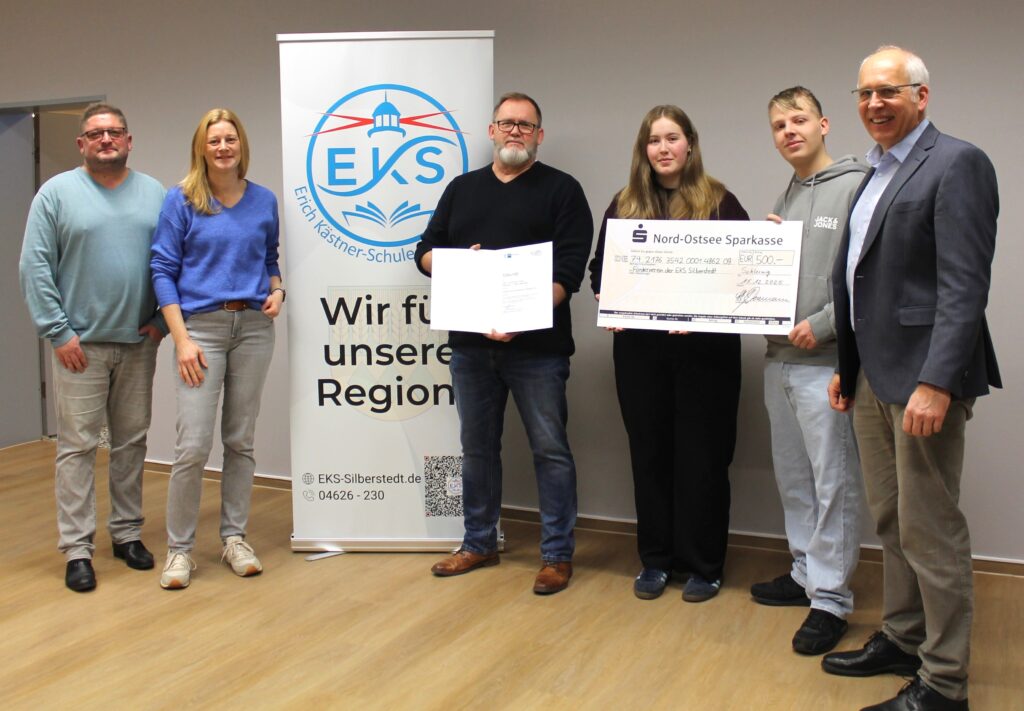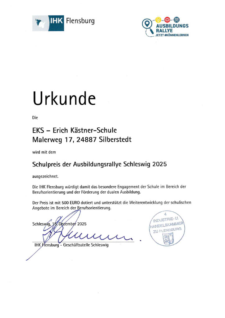 Am 15.12.2025 hatten wir Besuch aus Schleswig. Herr Wesemann, der Schleswiger Geschäftsstellenleiter der IHK, überreichte uns den Schulpreis der Ausbildungsrallye Schleswig. Die Industrie- und Handelskammer würdigt damit das besondere Engagement der Erich Kästner-Schule Silberstedt im Bereich der Berufsorientierung. Der Preis ist mit 500 € dotiert und soll die Weiterentwicklung der schulischen Angebote im Bereich der Berufsorientierung unterstützen. Den symbolischen Scheck der IHK nahmen die Schülervertreter Soline Hansen, Luca Hansen, Berufsberaterin Nicole Heitmann sowie Koordinator Michael Holtorf und Schulleiter Ulf Raddatz dankbar entgegen.