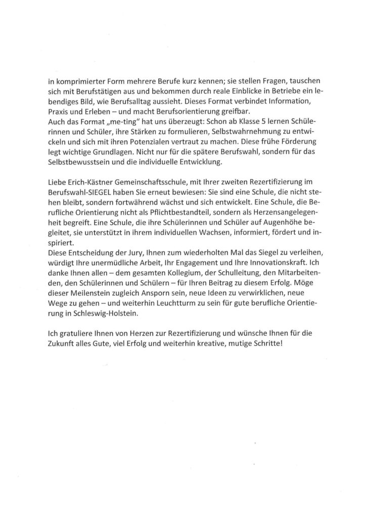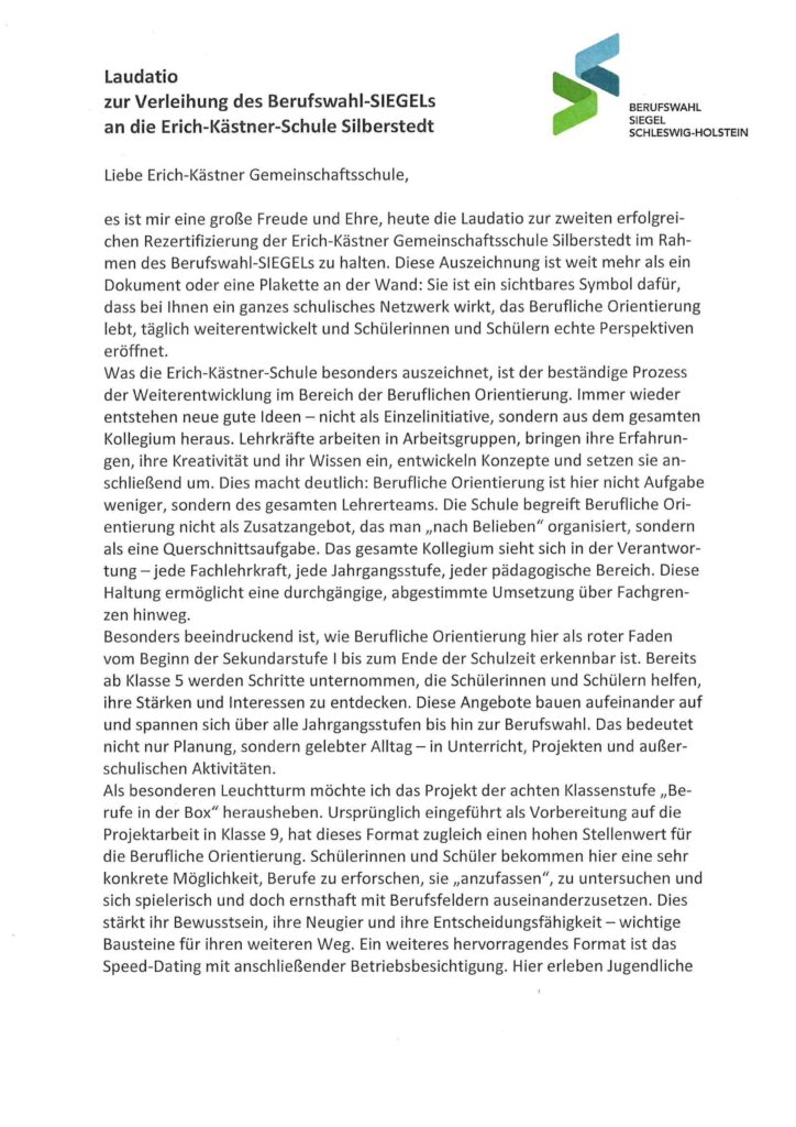 Wir wurden im Oktober 2025 dafür ausgezeichnet, dass wir das Berufswahl-SIEGEL in der Re-Re-Zertifizierung erneut erhielten. Hier die Begründung in der offiziellen Laudatio: